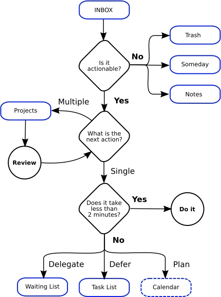 Capturing is just the beginning. It’s important to regularly process all of the “stuff” that you’ve capture to determine what meaning it has (if any) and whether there is any action to be taken. Everything that you’ve captured into your various physical and electronic inboxes is generically referred to as “stuff”. The process for processing this stuff is essentially the same whether it’s in a physical or electronic form.